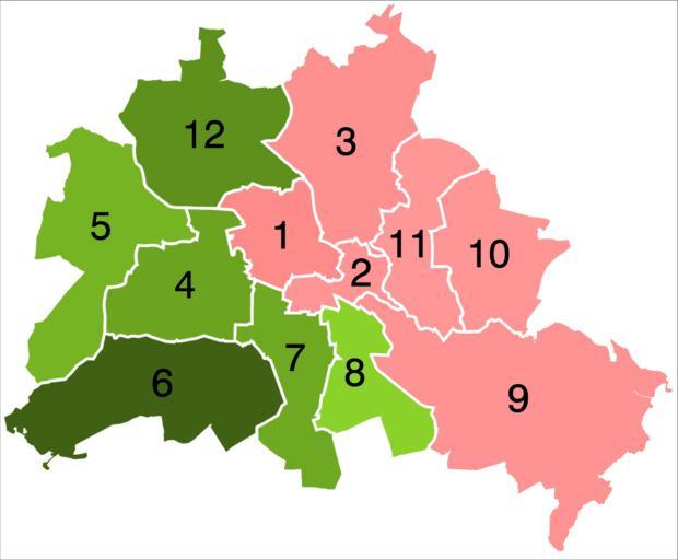 | Keywords: Proreliabstufungenstimmberechtigtejawaehlerfarbe.png de Anteil der Befürworter der Teilnehmern am Berliner Volksentscheid Pro Reli am 27 April 2009 nach Bezirken Quelle der Daten http //www wahlen-berlin de/wahlen/Volksentscheid-2009-ProReli/ergebnisse/ve09-proz asp dunkel 27 4 Ja-Stimmen der Stimmberechtigten Steglitz-Zehlendorf 6 bis hell 4 9 Ja-Stimmen der Stimmberechtigten Marzahn-Hellersdorf 10 Grün über 50 Ja-Stimmen der Teilnehmer Rot unter 50 Ja-Stimmen der Teilnehmer File Berliner Bezirke 2001 png 2009-04-27 User Friedrichstrasse map and Chin tin tin coloured File Proreliabstufungenstimmberechtigtejawaehler png File Pro Reli png wikitable sortable style text-align left - class hintergrundfarbe6 +Vorläufiges amtliches Endergebnis nach Angaben des Landeswahlleiters Berlin - style background DDFFDD; Nr Region Wahlbeteiligung Ja Wähler Ja Stimmberechtigte Nein Wähler Ungültig Wähler - style background FFDDDD; 1 Mitte 24 3 44 8 10 9 55 0 0 2 - style background FFDDDD; 2 Friedrichshain-Kreuzberg 26 2 27 1 7 1 72 7 0 2 - style background FFDDDD; 3 Pankow 27 9 28 9 8 1 70 9 0 2 - style background FFDDDD; 4 Charlottenburg-Wilmersdorf 33 8 60 4 20 4 39 4 0 2 - style background FFDDDD; 5 Spandau 28 1 69 2 19 4 30 7 0 2 - style background FFDDDD; 6 Steglitz-Zehlendorf 41 4 66 3 27 7 33 5 0 2 - style background FFDDDD; 7 Tempelhof-Schöneberg 33 6 60 9 20 5 38 9 0 2 - style background FFDDDD; 8 Neukölln 26 5 61 8 16 4 37 9 0 3 - style background FFDDDD; 9 Treptow-Köpenick 27 7 26 3 7 3 73 5 0 2 - style background FFDDDD; 10 Marzahn-Hellersdorf 21 6 22 7 4 9 77 0 0 3 - style background FFDDDD; 11 Lichtenberg 23 2 21 3 5 0 78 4 0 3 - style background FFDDDD; 12 Reinickendorf 33 2 69 1 22 9 30 7 0 2 - style background FFDDDD; Berlin insgesamt 29 2 48 5 14 2 51 3 0 2 Maps of Berlin |