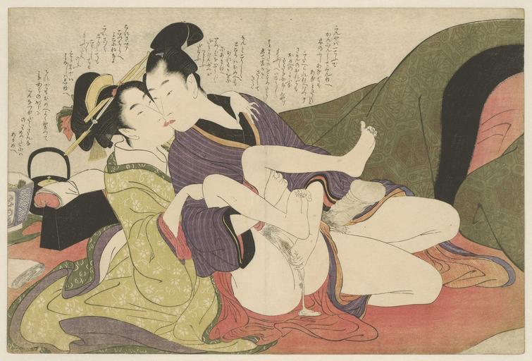 | Keywords: Prostituee kussend met jonge man-Rijksmuseum RP-P-2006-269.jpeg accession number RP-P-2006-269 Creator Kitagawa Utamaro credit line nl Prostituee in groene kimono kussend met een jonge man in paars gewaad In de achtergrond links tissues rechts een aan de kant geschoven deken Tweede van dertien prenten uit het album Negai no itoguchi ook wel vertaald met The prelude to desire Label Line Kitagawa Utamaro 1753 - 1806 1799 kleurenhoutsnede; lijnblok in zwart met kleurblokken Collection prenten; Japan collectie blad Height mm 253 blad Width mm 382 exhibition history Institution Rijksmuseum paper object history Acquisition 2006 object type prent PD-US PD-old-100 Data and photography rights All data and all images made available through the API are either in the public domain or are subject to a CC0 license https //www rijksmuseum nl/en/api/terms-and-conditions-of-use cc-zero place of creation Japan http //www rijksmuseum nl/collectie/RP-P-2006-269 http //hdl handle net/10934/RM0001 COLLECT 438533 handle Prostituee kussend met jonge man Uploaded with GWToolset Rijksmuseum RP-P-2006-269 http //www rijksmuseum nl/media/assets/RP-P-2006-269 Images uploaded by Fæ Images from the Rijksmuseum Japanese 18th-century prints in the Rijksmuseum Amsterdam |