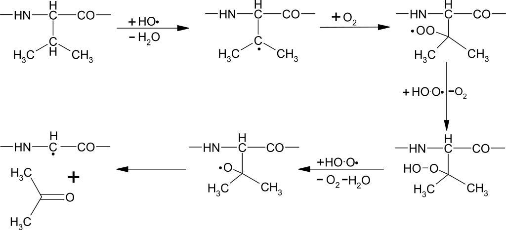 | Keywords: Proteinoxidation 03.svg Proteinoxidation durch reaktive Sauerstoffspezies beta-Spaltung von Valin Protein oxidation by reactive oxygen spezies beta-scission of valine own derived from E R Stadtman und R L Levine Chemical modification of proteins by reactive oxygen species In Redox Proteomics From Protein Modifications To Cellular Dysfunction And Diseases ' I Dalle-Donne A Scaloni und A Butterfield Editors Wiley Interscience Series on Mass Spectrometry 2006 ISBN 0-471-72345-2 p nsp;6 See also R Widmer http //opus kobv de/tuberlin/volltexte/2007/1504/ Wirkung von Hemmstoffen und Antioxidantien in Gliazellen bei Anoxie/Reoxygenierung und in der hepatischen Enzephalopathie Dissertation TU Berlin 2007 2010-01-17 Kuebi Armin Kübelbeck Protein degradation |
