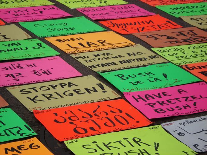| Keywords: Protest bush in 100 languages.jpg Signs from a demonstration outside the White House gates by Lafayette Square on Saturday March 24 2007 The demonstrations are run weekly by representatives from yellowcakewalk net en wikipedia Liftarn CommonsHelper 2007-03-29 Sox524 wikipedia en Sox524 Original upload log page en wikipedia Protest_bush_in_100_languages jpg 2007-03-29 03 13 Sox524 2816×2112× 2751988 bytes <nowiki>Signs from a demonstration outside the White House gates by Lafayette Square on Saturday March 24 2007 The demonstrations are run weekly by representatives from yellowcakewalk net </nowiki> Demonstrations and protests against George W Bush |