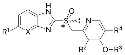 | Keywords: Proton pump inhibitors structure.svg proton pump inhibitor s Asterisk indicates stereocenter Dots indicate lone pair own Anypodetos 2012-02-07 pd-chem wikitable style margin 1em auto 1em auto; - rowspan 2 Compound colspan 5 Substituents rowspan 2 Form rowspan 2 Cysteine binding colspan 2 pK<sub>a</sub> First approval - X R<sup>1</sup> R<sup>2</sup> R<sup>3</sup> R<sup>4</sup> pKa<sub>a1</sub> pKa<sub>a1</sub> year - Omeprazole CH OCH<sub>3</sub> CH<sub>3</sub> CH<sub>3</sub> CH<sub>3</sub> Racemic mixture 813 and 892 4 06 0 79 1989 in USA - Esomeprazole CH OCH<sub>3</sub> CH<sub>3</sub> CH<sub>3</sub> CH<sub>3</sub> S - ˆ’ -enantiomer of lansoprazole 813 and 892 4 06 0 79 2001 in USA - Lansoprazole CH H CH<sub>3</sub> CH<sub>2</sub>CF<sub>3</sub> H Racemic mixture 813 and 321 3 83 0 62 1991 in Europe - Dexlansoprazole CH H CH<sub>3</sub> CH<sub>2</sub>CF<sub>3</sub> H R - + -enantiomer of lansoprazole 813 and 321 3 83 0 62 2009 in USA - Pantoprazole CH OCHF<sub>2</sub> OCH<sub>3</sub> CH<sub>3</sub> H Racemic mixture 813 and 822 3 83 0 11 1994 in Germany - Rabeprazole CH H CH<sub>3</sub> CH<sub>2</sub> <sub>3</sub>OCH<sub>3</sub> H Racemic mixture 813 892 and 321 4 53 0 62 1999 in USA - Tenatoprazole N OCH<sub>3</sub> CH<sub>3</sub> CH<sub>3</sub> CH<sub>3</sub> Racemic mixture 813 and 822 4 04 “0 12 ” valid svg Cc-zero Proton pump inhibitors |