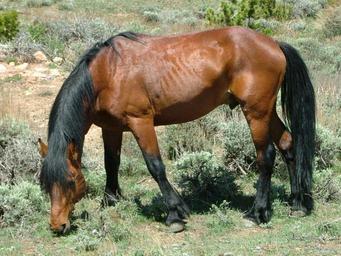 | Keywords: Pryor Mountains feral horse - 2009.jpg  en A feral or wild horse in 2009 at the Pryor Mountains Wild Horse Range in Montana in the United States This image depicts the classic features of this animal's unique genetic makeup DNA testing has shown that the Pryor Mountains herd is directly descended from the Spanish barb horse brought to North America in the mid 1600s A D by the Spanish The horse is generally 13-15 hands high and weigh 700 to 800 pounds more if raised in captivity The majority of Pryor Mountains horses are dun or grullo in color but some are red or blue roan bay black chestnut and rarelhy buckskin in color They minimally express calico paints Pryor Mountains horses look much like primitive horses with a dorsal stripe down the back stripes on the withers and tiger stripes on the legs Most have just five lumbar vertebrae an anatomical feature distinctive of primitive horses although some have a fifth and sixth vertebrae which are fused Pryor Mountains horses have medium-length necks long manes and tails convex or straight heads wide-set eyes and hooked ears The forehead is broad and tapers well to the muzzle The teeth meet evenly upper lip is usually longer than the lower and the nostrils are small and crescent shaped The horses have sloped croups and low tail-sets the shoulders are long and sloping the withers are prominent and the chest is medium to narrow in width The hooves are hard and ample and the horse exhibits the classic paso gait http //www fs fed us/r1/custer/projects/projects/d2_wildhorses/PMWHR pdf Billings Field Office Bureau of Land Management U S Department of the Interior Pryor Mountain Wild Horse Range/Territory Environmental Assessment MT-10-08-24 and Herd Management Area Plan May 2009 p 52 2009 PD-USGov Feral horses from Montana Pryor Mountains Wild Horse Range Blood bay horses Side views of horses |