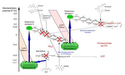 | Keywords: PS-Hemmer.svg de Z-Schema der Lichtreaktion mit Angriffspunkten der Photosystem-II-Hemmer DPC Diphenylcarbazid DCPIP 2 6-Dichlorphenolindophenol DBMIB Dibromthymochinon http //www uni-marburg de/fb17/fachgebiete/pflanzenphysio/lehre/fmpp/tag6 Lichtreaktion-z-schema svg 2014-07-27 Kopiersperre <span class signature-talk ></span> PD-own Photosynthesis Herbicides |