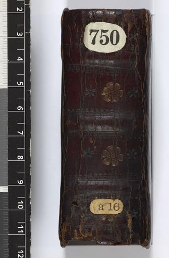 Keywords: Psalter and Canticles -2nd half of the 12th century - Spine (Add MS 40753).jpg Style Centrepiece; Caption Spine; Colour Brown; Edge Unspecified exhibition history Decorative Technique Tooled in gold; Cover Material Goatskin includes morocco turkey etc 18th century of wooden boards covered with dark red gilt-tooled leather In the centre of each side is an oval gilt-stamped panel of floral design like that in Add MS 40754 There are remains of metal clasps Eastern Mediterranean Likely Palestine or Cyprus given the script Canart 1981 Two clasps catching on to the upper cover object history Text 13c; Unspecified; Unspecified object type Cc-zero place of creation Binding Eastern Mediterranean place of discovery Unspecified British Library image http //www bl uk/catalogues/bookbindings/LargeImage aspx RecordId 020-000019492 ImageId ImageId 57742 Copyright BL Psalter and Canticles 2nd half of the 12th century Uploaded with GWToolset Psalter and Canticles 2nd half of the 12th century - Spine Add MS 40753 http //www webarchive org uk/bldatasets/bindings/add_ms_40753_fbspi jpg Bookbinding 18th-century bookbinding British Library Bookbindings Taken with Phase One IQ140 |