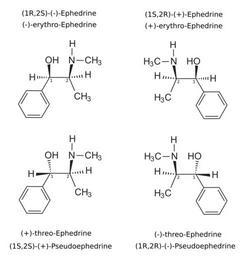 | Keywords: (pseudo)ephedrine enantiomers.svg en The two pairs of enantiomers of ephedrine Top ephedrine<br> Bottom pseudoephedrine<br> IUPAC Name 2- methylamino -1-phenylpropan-1-ol The stereocenters are numbered own Wickey-nl 2009-12-15 Ephedrine Pseudoephedrine Inkscape validSVG |