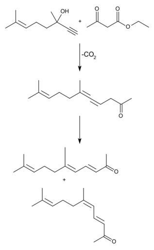 Keywords: Pseudojonone form Dihydrolinalool.svg CAROLL-Synthese Reaktion von Dehydrolinalool und Acetessigester zu Pseudojonon Reacton of Dehydrolinalolle and Ethylacetoacetate to Pseudojonone Own 2006-09-20 Andel Früh Chemical reactions Chemical syntheses |