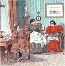 Keywords: PUK1894no45.jpg En datter laver lektier imens moderen og en syerske syr i et hjem i 1894 a daughter make piece of homework all the while the mother and a seamstress sew in a home in 1893 From the danish magazine Puk no 45 from 1894 PD-Art Mother and child in art Fashion in 1894 Sewing in art Women writing in art Sitting women in art Artworks missing infobox template Seamstresses in art |