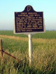 | Keywords: Pulaski County natural gas marker.png 40 57 46 8 N 86 53 30 W region US-IN_heading SW A historical marker in southwestern Pulaski County Indiana documenting the site of the state's first natural gas well Marker is located on the western side of U S Route 421 one and a half miles south of the town of Francesville Indiana Francesville It reads <blockquote> First Indiana Natural Gas Well<br /> One mile southwest of this marker gas was discovered in 1867 by G Bates while drilling for oil at a depth of 500 feet Gas wells were drilled in 1887-1888; gas piped into Francesville lasted only four years </blockquote> Own 2007-06-14 Huw Williams Huwmanbeing Files by User Huwmanbeing Historical markers in Indiana Natural gas Pulaski County Indiana |
