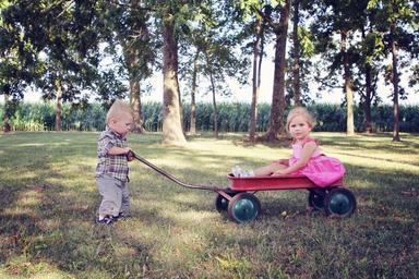 Keywords: pulling wagon people girl child childhood outside outdoors rural cornfield boy friends little male female youth