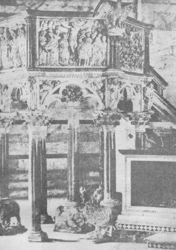 | Keywords: Pulpito Pisa 01.jpg en Nicola Pisano's pulpit with stairs in baptistry of Pisa Tuscany Italy it Pulpito di Nicola Pisano Duomo di Pisa; sono visibili le scale oggi rimosse Giorgio Batini Album di Pisa Firenze La Nazione 1972 Author Anni 1930 Pulpit in the Baptistry Pisa Historical images of the Baptistry Pisa PD-old |