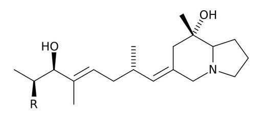 Keywords: Pumiliotoxin AB.svg Pumiliotoxin A R -H<br/> Pumiliotoxin B R -OH<br/> created with bkchem+inkscape 2006-04-01 own assumed Ayacop Pumiliotoxins