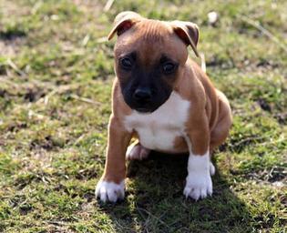 Keywords: puppy dog staffordshire bullterrier pet animal cute canine adorable breed purebred domestic mammal friend small portrait doggy pedigree little young funny brown pup sitting happy terrier looking alert fur obedient ears staffy companion domesticated friendly