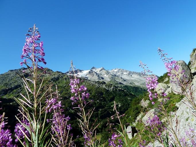 Keywords: purple flowers sky blue green pink plant perspective mountains switzerland somme day sunny pass great stone rock