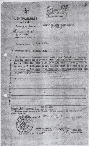 | Keywords: Putilov Matvei certificate from the archive 01.jpg ru Сп авка о дате и месте гибели и захо онения атвея ефодиевича Путилова погибшего п и обо оне Сталинг ада в 1942 году 2014-10-13 16 51 25 О игинал х анится в музее-заповеднике Сталинг адская битва Викто ия Вале ьевна Кохенде фе главный х анитель фондов музея-заповедника Сталинг адская битва Этот файл п едоставила для использования в википедии Викто ия Вале ьевна Кохенде фе главный х анитель фондов музея-заповедника Сталинг адская битва http //stalingrad-battle ru/ Сайт музея заповедника other versions cc-zero Uploaded with UploadWizard Battle of Stalingrad Documents in the Volgograd Panorama Museum People associated with World War II from the Soviet Union Putilov Matvei Mefodievich |