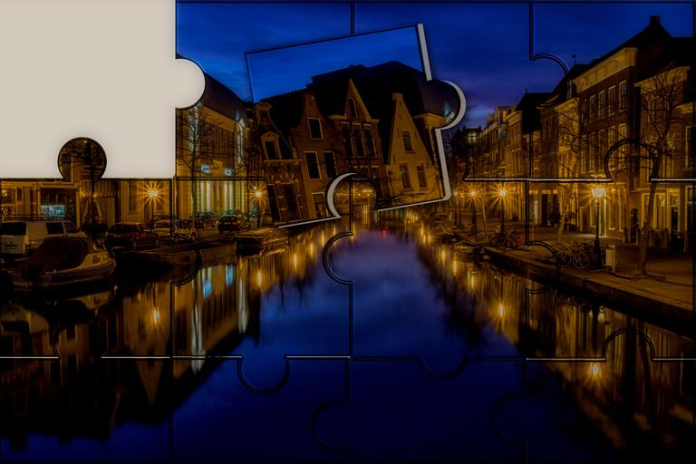 Keywords: puzzle city night waterway channel night sky lights street lanterns lighting reflection calm water channel holland homes boats suffering blue hour atmosphere road night photograph