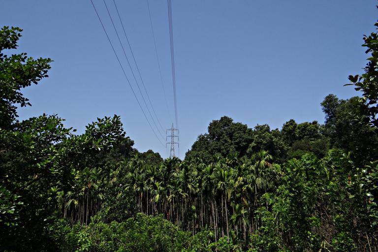 Keywords: pylon electric power power lines high voltage thick forest mountain arecanut plantation karnataka india