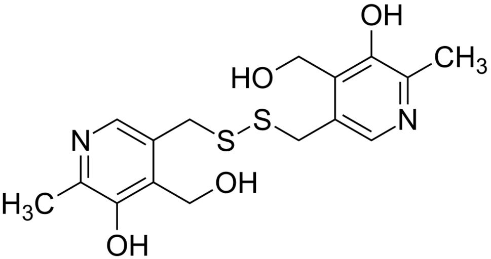 | Keywords: Pyritinol 200.svg  validSVG Structure of 5 5'- disulfanediylbis methylene bis 4- hydroxymethyl -2-methylpyridin-3-ol Own 2014-04-20 Emeldir <span class signature-talk >talk</span> Chemical structure verified https //upload wikimedia org/wikipedia/commons/b/bd/Pyritinol_200 svg 1S/C16H20N2O4S2/c1-9-15 21 13 5-19 11 3-17-9 7-23-24-8-12-4-18-10 2 16 22 14 12 6-20/h3-4 19-22H 5-8H2 1-2H3 SIXLXDIJGIWWFU-UHFFFAOYSA-N 1098-97-1 Synonyms <small><nowiki>3 3- Dithiodimethylene bis 5-hydroxy-6-methyl-4-pyridinemethanol 5 5'- disulfanediylbis methylene bis 4- hydroxymethyl -2-methylpyridin-3-ol 5 5-Dihydroxy-6 6-dimethyl-3 3-dithiodimethylenebis 4-pyridylmethanol dihydochloride monohydrate 5-5-hydroxy-4- hydroxymethyl -6-methylpyridin-3-ylmethyldisulfanylmethyl-4- hydroxymethyl -2-methylpyridin-3-ol Biocefalin Bonifen Bonol Cervitalin Dipyridoxolyldisulfide Encebrovit Encefabol Encerebron Epocan Piritinol Piritinol hidrocloruro de Piritinolo Pirytynolu dichlorowodorek Pyridoxine disulfide Pyridoxine-5-disulfide Pyrithioxin Pyrithioxine pyrithioxine Pyrithioxine Hydrochloride Pyritinol Pyritinol Hydrochloride Pyritinoli Dihydrochloridum Pyritinolum Pyritioxine Pyroxidine-5-disulfide Vitamin B6 disulfide</nowiki></small> PD-chem Hydroxypyridines Methylpyridines Organic disulfides |