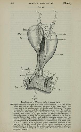 Keywords: PZSL1889Page438.png Macropus major Macropus giganteus <small> Shaw 1790 </small> ™ en Genitals of female Eastern Grey Kangaroo from dorsal <br/> a<sub>1</sub> / a<sub>2</sub> threads to fix median canal b probe through right lateral canal c probe through left lateral canal f keel-like process l l c left lateral canal l o left os uteri l ov left ovary m c median canal opened dorsally r<sub>1</sub> / r<sub>2</sub> halves of dissected rectum r l c right lateral canal r o right os uteri r ov right ovary u probe through urether u g c urogenital passage X opening of median canal into urogenital passage Y blind passages Proceedings of the Zoological Society of London http //archive org/details/proceedingsofgen89zool vol 1889 issue 4 http //archive org/stream/proceedingsofgen89zool page/438/mode/1up page 438 1889 published 1890 E C Stirling text PD-old-70-1923 PZSL 1889-4 Macropus giganteus anatomy Mammal female reproductive system Marsupial reproductive system |