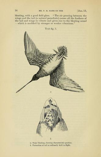 | Keywords: PZSL1907Page016.png Gallinago cœlestis Gallinago gallinago <small> Linnaeus 1758 </small> en Common Snipe in display flight bleating drumming winnowing etc from ventral above and tail in usual flight position from ventral below Proceedings of the Zoological Society of London http //archive org/details/proceedingsofzoo19071446zool vol 1907 issue 1 http //archive org/stream/proceedingsofzoo19071446zool page/n62/mode/1up page 16 1907 P H Bahr text PD-old PZSL 1907-1 Gallinago gallinago illustrations Scolopacidae in flight bird tails Scolopacidae anatomy |