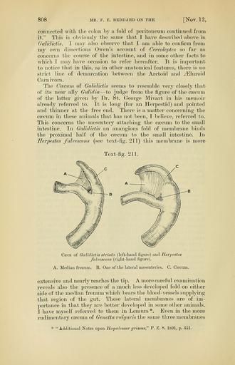 Keywords: PZSL1907Page0808.png Left Galidictis striata Galidictis fasciata striata <small>G Cuvier 1829</small> Right Herpestes fulvescens Herpestes fuscus flavidens <small> Kelaart 1850 </small> en Junction of small and large intestine of Broad-striped Malagasy Mongoose left and Indian Brown Mongoose right <br/> A Median frenum B One of the lateral mesenteries C Caecum Proceedings of the Zoological Society of London http //archive org/details/proceedingsofzoo19074471121zool vol 1907 issue 4 http //archive org/stream/proceedingsofzoo19074471121zool page/808/mode/1up page 808 1907 published 1908 F E Beddard text PD-old PZSL 1907-4 Galidictis fasciata Eupleridae anatomy Herpestes fuscus Herpestes anatomy Mammal digestive system |