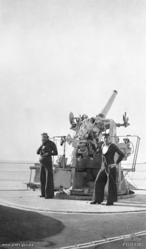 Keywords: QF 4 inch Mk V HA gun HMAS Canberra 1940 AWM P02550.005.jpeg AWM caption Two RAN sailors S3207 Able Seaman AB Percy A Tipper left and 23424 AB Cecil A Dobell right pose in front of their gun mount a 4 inch anti-aircraft gun forming part of the secondary armament of the Kent class cruiser HMAS Canberra HMAS Canberra was sunk on 9 August 1942 off Savo Island in the battle of Guadalcanal AB Dobell had drafted off the ship beforehand whereas AB Tipper survived the sinking uninjured P02550 005 Credit line Donor L Rudd ~ 1940 photographer not identified Copyright expired - public domain PD-AustraliaGov World War II forces of Australia QF 4 inch Mk V naval gun Canberra HMAS Canberra D33 Black and white photographs |