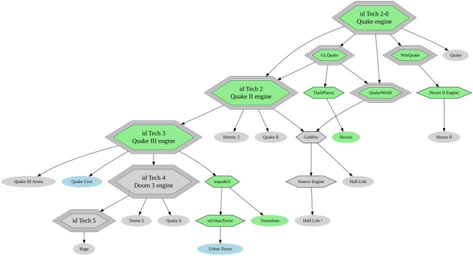 Keywords: Quake - family tree 2 Simplified.svg id Tech family of video game engines by Id Software id Tech 1 debut in Quake in June 1996 Id Tech 2 debut in Quake II in December 1997 id Tech 3 debut in Quake III Arena December 1999 id Tech 4 debut in Doom 3 in August 2004 <br> Note id Tech 5 debut in Rage in October 2011 and id Tech 6 TBA are not available under the GNU General Public License GPL <br>Note Quake Wars Ray Traced and Wolfenstein Ray Traced are a different engines <br> Legend <span style color 85dc85 > –ˆ –ˆ</span> free/libre <span style color b1dae7 > –ˆ –ˆ</span> freeware <span style color cfcfcf > –ˆ –ˆ</span> commercial <span style color cfcfcf;background-color 85dc85 > –Œ –Œ</span> available with commercial license or free/libre license ellispe shape for games hexagon shape for engines using the command <code>fdp</code> from the http //www graphviz org/ Graphviz package Feel free to patch this code or to talk about it in his talk page <pre> // dot -oengine svg -Tsvg engine dot digraph ratio auto; sep +4 5 ; // // Engines // node shape polygon sides 6 style filled // id Tech engines node peripheries 4 size 6 // id Tech engines under GPL node fillcolor lightgreen idTech1-0 label id Tech 1-0\nQuake engine fontsize 20 GLQuake WinQuake QuakeWorld idTech2 label id Tech 2\nQuake II engine fontsize 20 idTech3 label id Tech 3\nQuake III engine fontsize 20 idTech4 label id Tech 4\nDoom 3 engine fontsize 20 // id Tech under commercial license node fillcolor lightgrey idTech5 label id Tech 5 fontsize 20 // Other engines // node peripheries 1 // Other commercial engines node fillcolor lightgrey GoldSrc SourceEngine label Source Engine // Other libre/open engines node fillcolor lightgreen DarkPlaces HexenIIengine label Hexen II Engine ioquake3 ioUrbanTerror // // Games // node shape ellipse color transparent // Commercial Games node fillcolor lightgrey Doom3 label Doom 3 Heretic2 label Heretic 2 HexenII label Hexen II Quake QuakeII label Quake II QuakeIIIArena label Quake III Arena Quake4 label Quake 4 Rage // GoldSrc Source HalfLife label Half-Life Halflife2 label Half-Life ² // Freeware games node fillcolor lightblue QuakeLive label Quake Live UrbanTerror label Urban Terror // Libre/open games node fillcolor lightgreen Nexuiz // // Trees // // Games idTech2-0 -> Quake DarkPlaces -> Nexuiz HexenIIengine -> HexenII GoldSrc -> HalfLife SourceEngine -> Halflife2 idTech2 -> Heretic2; QuakeII; idTech3 -> QuakeIIIArena; QuakeLive; ioquake3 -> Tremulous ioUrbanTerror -> UrbanTerror idTech4 -> Doom3; Quake4; idTech5 -> Rage // Main engines idTech2-0 -> idTech2 -> idTech3 -> idTech4 -> idTech5 // Derivated engines idTech2-0 -> GLQuake -> idTech2 idTech2-0 -> QuakeWorld -> GoldSrc idTech2-0 -> WinQuake -> HexenIIengine GLQuake -> QuakeWorld; DarkPlaces; GoldSrc -> SourceEngine idTech2 -> GoldSrc idTech3 -> ioquake3 ioquake3 -> ioUrbanTerror </pre> Quake Video game family trees |