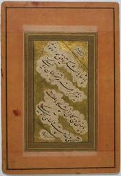 | Keywords: Quatrain for a King WDL7028.png  Artwork ru  и -'Али Хусайни Ха ави п иблизительно 1476 1543 гг fr Mīr ʻAlī Ḥusaynī Haravī 1476-1543 env en Mīr ʻAlī Ḥusaynī Haravī approximately 1476-1543 zh 米尔·阿里·乌萨尼·哈拉维,约 1476-1543 年 pt Mīr ʻAlī Ḥusaynī Haravī aproximadamente entre 1476 e 1543 ar مير علي حسيني الهَرَوي، حوالي 1476-1543 es Mīr ʻAlī Ḥusaynī Haravī circa 1476-1543 ru Четве остишие для п авителя fr Quatrain pour un roi en Quatrain for a King zh 为国王  的四行诗 pt Quadra para um rei ar رُبَاعِيَّة في أحد المُلوك ru В этом каллиг афическом ф агменте соде жится <em> убаи</em> четве остишие выполненное пятистопным ямбом написанное по диагонали че ными че нилами письмом насталик в об амлении полос из облаков на золотом фоне Текстовая панель заключена в несколько одноцветных  амок и наклеена на большой лист бумаги  озового цвета ук епленный ка тоном Стихотво ение начинается в ве хнем п авом углу со вступительного об ащения к Huwa al-fard al-ahad Богу Единому и  еповто имому Последующие ст оки гласят О П авитель удача соп овождает тебя /Восп янь если желаешь завоевать ми /В зените сове шенства сотво и свое п авление /Ты бдишь служа сознательным се дцам В этом поэтическом об ащении п авителя п изывают пове гнуть в агов с помощью ве ной свиты и удачи Также ему дается совет быть бдительным и служить своему на оду   людям с сознательными се дцами В нижнем левом углу каллиг аф Али подтве ждает что он выполнил эту  аботу Установлено что Али является каллиг афом  и -Али Хусайни Ха ави около 1476 1543 гг кото ый  аботал в Ге ате сов еменный Афганистан в XVI веке пока он не был п изван в Буха у сов еменный Узбекистан в 1528 1529 гг п авителем из династии Шейбанидов Убайдулла-ханом Узбеком  и -Али был не только искусным каллиг афом но и полноп авным поэтом сочинившим несколько <em>qit'a</em> ф агмента ных стихов в честь своих пок овителей Возможно это одно из стихотво ений написанное им для пок овительствующего п авителя <br>Каллиг афия пе сидская; Иллюмини ование  укописей; Исламские  укописи; Ко оли и п авители; Письмо насталик; Пе сидская поэзия; Поэзия fr Ce fragment de calligraphie est composé d'un <em>ruba'i</em> quatrain en pentamètre iambique écrit en caractères nasta'liq noirs et obliques dans des rubans de nuage sur un fond doré Le panneau de texte apparaît dans plusieurs cadres monochromatiques et il est collé sur une feuille rose plus grande et cartonnée Le poème commence par une invocation à Huwa al-fard al-ahad Dieu « le Seul et l'Unique » dans l'angle supérieur droit puis les vers indiquent  « Oh roi le cortège de la bonne fortune t'accompagne / Lève-toi si tu veux t'emparer du monde / Avec une telle apogée de la perfection ton règne prend forme / Tu possèdes le savoir et sers les cœurs conscients » Cet hommage poétique dédié à un roi encourage ce dernier à vaincre son ennemi grâce à son cortège loyal et sa bonne fortune Il lui conseille également de connaître et de servir son peuple « ceux ayant un cœur conscient » Dans l'angle inférieur gauche le calligraphe 'Ali indique qu'il écrivit cette œuvre 'Ali n'est autre que Mīr ʻAlī Ḥusaynī Haravī 1476 1543 env calligraphe qui fut actif dans la ville d'Hérat aujourd'hui en Afghanistan au cours du XVI<sup>e</sup> siècle jusqu'à ce qu'il fut emmené à Boukhara en actuel Ouzbékistan en 1528 ou 1529 par le souverain chaybanide 'Ubaydallah Khan Uzbek Mir ʻAlī était non seulement un maître de la calligraphie mais également un poète à part entière qui composa plusieurs <em>qit'a</em> échantillons de vers en l'honneur de son saint protecteur Il s'agit peut-être de l'un des poèmes qu'il composa pour un roi bienfaiteur <br>Calligraphie persane; Enluminures; Manuscrits islamiques; Rois et dirigeants; Écriture nastaliq; Poésie persane; Poésie en This calligraphic piece includes a <em>ruba'i</em> iambic pentameter quatrain written diagonally in black Nasta'liq script outlined in cloud bands on a gold background The text panel is provided with several monochromatic frames and is pasted onto a larger pink sheet strengthened by cardboard In the top right corner an invocation to Huwa al-fard al-ahad God the Unique and the Only begins the poem The subsequent verses read Oh King the retinue of good fortune escorts you / Rise if you intend to capture the world / With such a summit of perfection form the presence of your rulership / You are aware and you serve the conscious hearts This poetic tribute to a king encourages him to defeat his enemy with the support of his faithful retinue and good fortune It also advises him to be aware