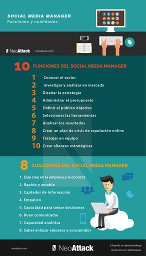 Keywords: marketing online social media redes sociales manager gestor contenidos twitter facebook pinterest instagram tumblr flirckr snapchat screenshot text neoattack.com/social-media-manager-toda-la-informacion-so... SOCIAL MEDIA MANAGER: CUALIDADES, TAREAS Y COMO SER UNO Antes de comenzar, con qué hace el Social Media Manager y comentar sus funciones, cualidades y como llegar a ser uno me gustaría es necesario aclarar algunas cuestiones que suelen surgir a las empresas y profesionales en torno a este tema. Todo sobre el Social Media Manager ¿Si soy una pequeña empresa necesito un Social Media Manager? Sí. Necesitas un Social Media Manager porque al igual que trazaste una estrategia para tu empresa necesitarás trazar una estrategia para las redes sociales. Si no trazas una estrategia y analizas los resultados tus acciones serán dispares y no sabrás con exactitud qué tipo de acciones funcionan mejor o si los objetivos que propusiste los has alcanzado. ¿Social Media Manager es lo mismo que Community Manager? No. El Social Media Manager se encargar de la estrategia y el Community Manager del trabajo de campo. Es decir, el Social Media Manager creará el Plan Social Media (analizará el entorno, distribuirá el presupuesto, fijará los objetivos, elegirá las redes sociales en las que estar , etc.) para que se cumplan los objetivos, analizará los resultados y cambiará lo que sea necesario en la estrategia para que estos se cumplan y el Community Manager realizará todas las acciones que se establecieron en la estrategia para lograr cumplir los objetivos. que es un social media manager ¿Qué es un Social Media Manager? “Un Social Media Manager es aquel encargado de trazar estrategia y analizar los resultados y un Community Manager es quien lleva a cabo las acciones para conseguir los alcanzar planteados en la estrategia” ¿Puedo hacer yo de Social Media Manager? Un día un amigo al que nunca le había gustado la carpintería decidió construir un armario. Este tardó 10 veces más de lo que hubiese tardado un carpintero y encima el armario no quedo del todo bien, teniendo finalmente que comprar otro porque al poco tiempo ya estaba cogeando y las baldas se movían. El intentar hacerlo él mismo le supuso una pérdida enorme de tiempo además de tener que gastar el doble del presupuesto que tenía previsto para aquel armario. A partir de entonces nunca más lo dudó. Cada profesión tiene sus expertos y si no tienes unos conocimientos medios o has hecho un curso de carpintería, mejor que no te pongas a construir armarios. ¿Cómo ser Social Media Manager? En el caso de que quieras ser Social Media Manager, lo que te aconsejo es que hagas algún curso respaldado por una gran empresa en la que sepas que vas a obtener los conocimientos necesarios para ejercer la profesión correctamente. Infórmate y fórmate antes de buscar un puesto de trabajo de este estilo. Si estás buscando formación, unas buenas escuelas especializadas en formación Social Media son Aula CM y Adveischool pero existen muchas otras también muy buenas. Para asegurarte de que la formación que te imparten es la suficiente para poder ejercer la profesión, asegurate de que el curso incluye todas las funciones que mencionamos más adelante. que hace un social media manager QUE HACE UN SOCIAL MEDIA MANAGER Las funciones de un Social Media Manager son muy importantes ya que de él dependerá no solo gran parte de la estrategia de comunicación online de la empresa, sino que también que las tareas realizadas por el Community Manager sirvan para algo. Social Media Manager funciones Conocer del sector: El Social Media Manager debe conocer el sector de la empresa para poder ejercer mejor el resto de funciones. Investigar y analizar el mercado: Investigaciones de mercado, elaboración de análisis interno y externo y dafo para tener una visión objetiva y global de la empresa. Diseñar la estrategia: Es el encargado de diseñar la estrategia social media y de crear el Social Media Plan de la empresa, que estará en coherencia y perfectamente alieado con el business plan y los objetivos generales de la empresa. Entre otras, deberá tener en cuenta en su estrategia: Campañas promocionales, concursos, publicidad en redes, eventos, lanzamiento de productos, etc. Estrategia de contenido, forma de comunicar, calendario de contenido, horas de publicación,etc. Administrar el presupuesto: Controlar y administrar el presupuesto así como las distintas partidas para cada una de las acciones a realizar en redes sociales. Definir el publico objetivo: Definir el público objetivo al que estarán dirigidas cada una de las campañas y acciones que se realicen. Seleccionar las herramientas: Seleccionar qué herramientas y apps utilizar para llevar a cabo las tareas y la medición de análisis de resultados. Analizar los resultados: Definir y controlar social media KPIs, conversiones y ROI. Análisis de reportes del Community Manager para medir la eficacia y modificar estrategias en caso de ser necesario. Crear un plan de crisis de reputación online: El Social Media Manager deberá diseñar el manual de gestión de crisis de reputación online de la empresa. Trabajar en equipo: Trabajar codo a codo con el cliente y con los distintos departamentos de la empresa, para analizar los resultados y plantear mejoras estratégicas: Relaciones Públicas, Marketing, Producto, Ventas, Directorio. Crear alianzas estratégicas: Trabajar en el desarrollo de alianzas estratégicas dentro del sector de social media para acciones futuras que puedan reforzar el crecimiento de las comunidades y de la marca. Hasta aquí entonces, es lo que podemos decir que es propio de un SMM, lo cual deja para el Community Manager a rasgos generales, la misión de construir, gestionar y administrar una comunidad en las distintas plataformas de social media, con el objetivo de establecer y sostener una relación duradera y recíproca con ésta. Inspiré el siguient