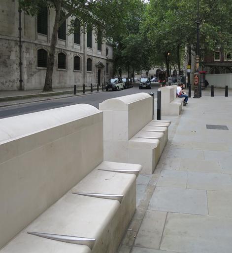 | Keywords: bench street benches streetbenches royal courts of justice royalcourtsofjustice the strand thestrand aldwych holborn london wc2 londonwc2 st clement danes stclementdanes street furniture streetfurniture setha low sethalow alex andreou alexandreou ocean howell oceanhowell defensive architecture defensivearchitecture ══════════════════════════════════ NOTE: I've updated the comment below to add material on an article and a radio interview by Alex Andreou; and a podcast with Setha Low. (February and March 2015) ══════════════════════════════════ Above: Benches outside the Royal Courts of Justice in The Strand London WC2 Portland stone clad benches where you can sit. But probably not sleep because of the metal dividers. They are part of the "security measures around the perimeter of the Royal Courts of Justice". The phrase comes from the report by Westminster City Council on 15 October 2012, which approved this and other measures. "The City’s Barbed Cruelty" But "Defensive Architecture" isn't only about protecting the public courts. Alex Andreou wrote a powerful and thoughtful article about the issue, which deserves to be read carefully. Its title is: "The Anti-homeless spikes: Sleeping rough opened my eyes to the city’s barbed cruelty." The Guardian: 18 February 2015. Here's the link to read the article online or download it. As you might expect from the title, Alex Andreou makes a strong plea against the practice of "designing against" homeless people and its deliberate unkindness. "... from ubiquitous protrusions on window ledges to bus-shelter seats that pivot forward, from water sprinklers and loud muzak to hard tubular rests, from metal park benches with solid dividers to forests of pointed cement bollards under bridges, urban spaces are aggressively rejecting soft, human bodies." But, he says, it's not simply against homeless people. Because we are all damaged by this. "When we make it impossible for the dispossessed to rest their weary bodies at a bus shelter, we also make it impossible for the elderly, for the infirm, for the pregnant woman who has had a dizzy spell. By making the city less accepting of the human frame, we make it less welcoming to all humans. By making our environment more hostile, we become more hostile within it". § Alex Andreou "You’ll Never Live Like Common People". New Statesman 6 March 2013. § Alex Andreou refers to the historian Ocean Howell. Both were interviewed about defensive architecture in a radio programme on 17 March 2015, on CBC Radio Toronto. Setha Low: "A Just City and a Vibrant Public Space" Alex Andreou's Guardian article also references Setha Low of City University New York (CUNY) . Professor Low was interviewed on 21 February 2015 by KCBS Radio San Francisco. Listen to or download a 6 minute podcast here. Here's the final minute. KCBS interviewer : Are there also some other unintended consequences? For example, benches provided for somebody who's elderly. And maybe really just needs to sit down because they're tired? Setha Low : I should be very clear. This kind of defensive architecture is anti-human. It's not just anti-homeless. It's anti-everyone; it's anti-elderly; anti-children. It's really not thinking about trying to build a just city and a vibrant public space. And that the increasing use of architecture - it was very popular in the seventies - and then it went away. And now it's coming back again. It has to do with the cleaning-up and the, sort of, sanitising of our public spaces. And their increasing privatisation. And decisions being made of who should be in those public spaces. These ordinances and changing in rules doesn't just keep away people who are homeless and have no place to go. But also does not provide for youth of colour. And doesn't provide for elderly. Doesn't provide for anyone with disabilities. It has wide ranging impact on the vitality of our public space today. And doesn't bode well for the future." _____________ Oranges and Lemons The building on the left of my photo is the Christopher Wren church of St Clement Danes. Walking past I was disappointed not hear the bells chime the tune of the nursery rhyme "Oranges and Lemons ". Though this is not the only St Clements which claims to be the church mentioned. _______________________________ § Website of St Clement Danes Church. § The nursery rhyme Oranges and Lemons may refer to this church or to St Clements Eastcheap. § The bells of St Clement Danes ring the tune. ══════════════════════════════════ NOTE: I've updated the comment below to add material on an article and a radio interview by Alex Andreou; and a podcast with Setha Low. (February and March 2015) ══════════════════════════════════ Above: Benches outside the Royal Courts of Justice in The Strand London WC2 Portland stone clad benches where you can sit. But probably not sleep because of the metal dividers. They are part of the "security measures around the perimeter of the Royal Courts of Justice". The phrase comes from the report by Westminster City Council on 15 October 2012, which approved this and other measures. "The City’s Barbed Cruelty" But "Defensive Architecture" isn't only about protecting the public courts. Alex Andreou wrote a powerful and thoughtful article about the issue, which deserves to be read carefully. Its title is: "The Anti-homeless spikes: Sleeping rough opened my eyes to the city’s barbed cruelty." The Guardian: 18 February 2015. Here's the link to read the article online or download it. As you might expect from the title, Alex Andreou makes a strong plea against the practice of "designing against" homeless people and its deliberate unkindness. "... from ubiquitous protrusions on window l