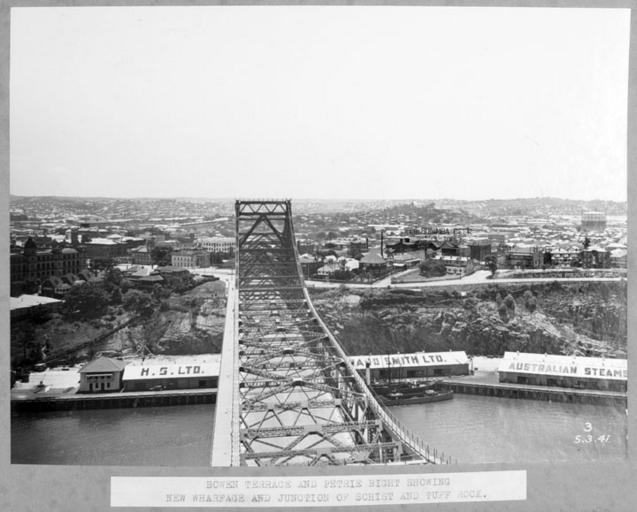 | Keywords: Queensland State Archives 4057 Bowen Terrace and Petrie Bight showing new wharfage and junction of schist and tuff rock Brisbane 5 March 1941.png en Bowen Terrace and Petrie Bight showing new wharfage and junction of schist and tuff rock Brisbane Story Bridge construction 1941-03-05 http //www archivessearch qld gov au/Image/DigitalImageDetails aspx ImageId 4057 Preferred citation Queensland State Archives Digital Image ID 4057 ID label 1249604 http //www archivessearch qld gov au/Search/AgencyDetails aspx AgencyID 1995 Lands Department Survey Office Cartographic Branch Photographic Section en Copyright expired Information field Decade 1940-1949 Information field Place en Brisbane City Information field Material Type en Photographic material Information field Type en Image PD-Australia QSA media uploaded by User 99of9 Photographic material from the Queensland State Archives 1941 in Queensland Wharves and quays in Queensland Outcrops in Australia Schist Tuff Bowen Terrace New Farm Story Bridge construction Petrie Bight |