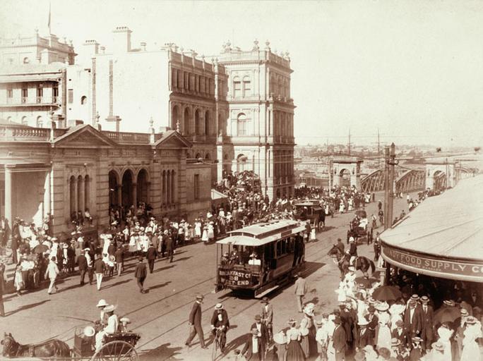 Keywords: Queensland State Archives 5167 Tram and crowd scene in Queen Street near George Street Brisbane c 1899.png en Tram and crowd scene in Queen Street near George Street Brisbane 1899 http //www archivessearch qld gov au/Image/DigitalImageDetails aspx ImageId 5167 Preferred citation Queensland State Archives Digital Image ID 5167 ID label 1367621 http //www archivessearch qld gov au/Search/AgencyDetails aspx AgencyID 1993 Lands Department Survey of Lands Branch Photographic Branch en Copyright expired Information field Decade 1890-1899 Information field Place en Brisbane City Information field Keywords en Horse-drawn vehicles Information field Material Type en Photographic material Information field Type en Image PD-Australia QSA media uploaded by User 99of9 Photographic material from the Queensland State Archives 1899 in Brisbane Queen Street Brisbane George Street Brisbane Second Victoria Bridge Brisbane Trams in Brisbane Treasury Building Brisbane |