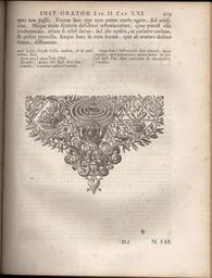 Keywords: Quintilian, Institutio oratoria ed. Burman (Leiden 1720), p. 209.jpg Quintilian ™s Institutio oratoria ed by Pieter Burman n the Elder Leiden 1720 Full title M Fabii Quinc tiliani de institutione oratoria libri duodecim cum notis et animadversionibus virorum doctorum summa cura recogniti et emendati per Petrum Burmannum Lugduni Batavorum Apud Joannem de Vivie MDCCXX This page contains the end of book II; emblematic woodcut used as final ornament Quintilians Institutio oratoria hrsg von Pieter Burman n dem Älteren Leiden 1720 Voller Titel M Fabii Quinc tiliani de institutione oratoria libri duodecim cum notis et animadversionibus virorum doctorum summa cura recogniti et emendati per Petrum Burmannum Lugduni Batavorum Apud Joannem de Vivie MDCCXX Diese Seite enthält den Schluss von Buch II; der emblematische Holzschnitt als Schlussstück benutzt d h als Schlussornament am Ende der Kolumne own Scanned by Aristeas Roman Eisele Artist of woodcut unknown 1720 book printed ; 2010-01-01 scan thumb left Detail of the woodcut PD-old Quintilian Institutio oratoria ed Burman Leiden 1720 page 209 18th-century woodcuts Emblem books book covers single pages etc |