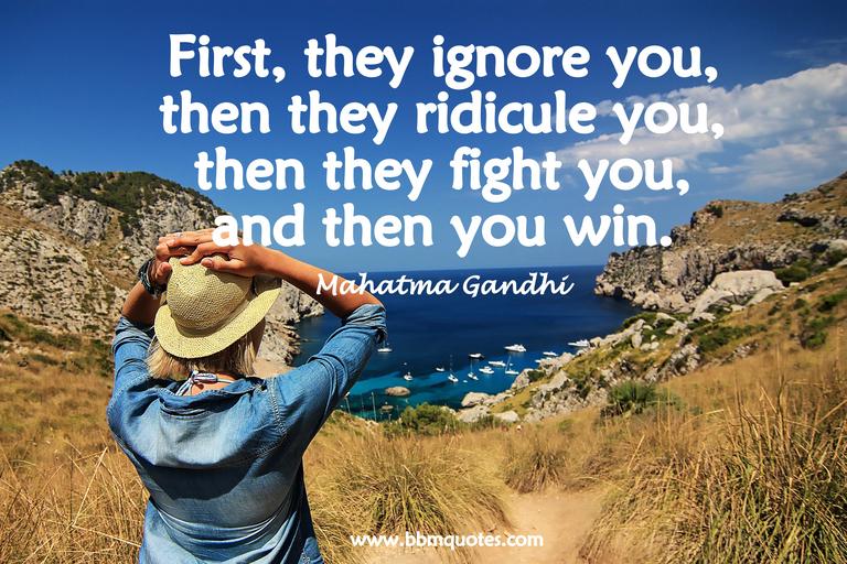 Keywords: rocks quotes outdoor First they ignore you, then they ridicule you, then they fight you, and then you win. www.bbmquotes.com/quote-by-mahatma-gandhi/ First they ignore you, then they ridicule you, then they fight you, and then you win. www.bbmquotes.com/quote-by-mahatma-gandhi/ |