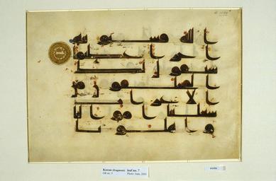 | Keywords: Qur'anic Verses WDL2434.jpg Artwork ru Стихи Ко ана fr Versets coraniques en Qur'anic Verses zh 古兰经经文 pt Versos do Alcorão ar آيات قرآنية ru В этом каллиг афическом ф агменте соде жатся 10-11-й стихи 48-ой главы Ко ана озаглавленной Су ат аль-Фатх <i> </i> Победа Данная <i>су а</i> дати ована пе иодом едины и включает в себя 29 стихов В ней описывается победа основанная на мужестве ве е и долготе пении кото ая да уется ве ующему если он остается ве ен Богу всякий же на ушающий Его Бога клятву наносит в ед собственной душе а всякий кто остается ве ен своему обещанию Богу получит наг аду от Бога 48 10 Текст написан ш ифтом куфи че ными че нилами на пе гаменте Текст на лицевой сто оне ф агмента выполнен на волосяной сто оне пе гамента благода я чему он п ек асно сох анился Текст на обо отной сто оне ф агмента значительно сте ся поскольку был нанесен на мясную сто ону пе гамента Диак итические знаки изоб ажены в виде к асных точек хотя имеются и точки желтого зеленого и синего цвета Знак окончания стиха между 10 и 11 стихом азмещен в ве хнем левом углу на лицевой сто оне листа Это знак означает конец десятого стиха и изоб ажен в фо ме золотого медальона в цент кото ого вписано слово <i> аша </i> десять Текст выполнен в стиле типичном для Ко анов написанных го изонтально кото ые изготавливались в девятом веке на пе гаменте <br>А абская каллиг афия; Иллюмини ование укописей; Исламская каллиг афия; Ко ан fr Ce fragment calligraphique comprend les versets 10-11 du 48ème chapitre du Coran intitulé Surat al-Fath<i> </i> Victoire Cette <i>Sourate</i> date de la période Medinan et contient 29 versets elle décrit la façon dont le triomphe découle du courage de la foi et de la patience si le croyant reste fidèle à Dieu toute personne qui viole son de Dieu serment le fait au préjudice de sa propre âme et toute personne qui remplit ses engagements envers Dieu elle en sera récompensée par Dieu 48 10 Le texte est en Kufi écrit à l'encre noire sur un parchemin Le texte sur le recto du fragment est écrit sur le côté sec et donc le parchemin est bien conservé Le texte sur le verso du fragment est sensiblement usé en raison du travail d'écriture réalisé sur son côté parchemin Les signes diacritiques apparaissent comme des points rouges mais certains points en jaune vert et bleu sont également reportés Un verset marqueur entre les versets 10 et 11 est placé dans le coin supérieur gauche du recto du feuillet Comme il s'agit d'un dixième verset marqueur il prend la forme d'un médaillon d'or peint avec le mot <i>'ashar</i> dix inscrit en son centre Le texte a été écrit dans le style typique des Qur'ans à l'horizontale sur parchemin produits au cours du neuvième siècle <br>Calligraphie arabe; Enluminures; Calligraphie islamique; Coran en This calligraphic fragment includes verses 10-11 of the 48th chapter of the Qur'an entitled Surat al-Fath<em> </em> Victory This <em>surah</em> dates from the Medinan period and contains 29 verses It describes how triumph comes from courage faith and patience if the believer stays true to God anyone who violates His God's oath does so to the harm of his own soul and anyone who fulfils what he has convenanted with God God will soon grant him a reward 48 10 The text is executed in Kufi script with black ink on parchment The text on the fragment's recto is executed on the hair side of the parchment and thus is well preserved The text on the fragment's verso has worn off substantially due to its execution on the flesh side of the parchment Diacritics appear as red dots although some dots in yellow green and blue are included as well A verse marker between verses 10 and 11 is placed in the upper left corner of the folio's recto As it is a tenth-verse marker it takes the shape of a gold-painted medallion with the word <em>'ashar</em> ten inscribed in its center The text is executed in the style typical of horizontal Qur'ans produced on parchment during the ninth century <br>Arabic calligraphy; Illuminations; Islamic calligraphy; Koran zh 该书法片段包含可兰经第 48 章第 10-11 节诗句,标题为 Surat al-Fath<i> </i>( 利) 章节 <i>这些章节</i> 起源于麦 那时 ,包括 29 句诗词 它描述了信徒们诚实 对上 时如何从勇气 信仰与 心中获得成功:任何人如不信守承诺,会危害到自己的心灵,若履行了对上 的承诺,上 会很快给予他回报(48 10) 这些库法体的文字用黑色墨水书写 羊皮纸上 正 的文字书写 羊皮纸的毛 上,因此至今 存完好 反 的文字基 上已模糊不清,因为这些文字书写 羊皮纸的皮里 发音符号用红色小点表示,但也 些符号用黄色 绿色与 色小点表示 纸张正 左上角 处诗句第 10 节与第 11 节的调换标记 因为这是第十节诗句的标记,标记形状为 个金色徽章,徽章中心部分为文字 <i> 'ashar</i> (十) 这些文字是 9 世纪用羊皮纸书写的横排可兰经的经
