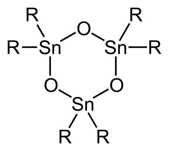 Keywords: R2SnO-cyclic-trimer-2D.png Cyclic trimer structure adopted by diorganotin oxides R<sub>2</sub>SnO<sub>n</sub> where R is a bulky group such as tert-butyl or mesityl Image based on several crystal structures in the CSD discussed in http //dx doi org/10 1016/S0010-8545 02 00178-9 Coord Chem Rev 2002 235 1 “52 Own 2011-12-23 Ben Mills Benjah-bmm27 Images by Ben Mills Diorganotin oxides |