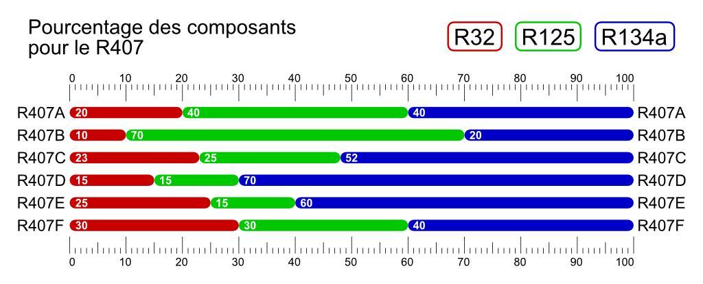 Keywords: R407-differents melanges-fr.png fr Mélange des fluides frigorigènes R32 R125 R134a dans différentes proportions R407A R407B R407C R407D R407E R407F 2012-01-05 own Fylip22 cc-zero Refrigeration Uploaded with UploadWizard Unidentified graphs