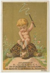 | Keywords: trade card tradecard printing 1800s vintage cherub tortoise r.c. geddes rubber goods rcgeddesrubbergoods photo border Illustrated trade card depicting a cherub riding on the back of a tortoise with a whip in mid-air on a flower-lined path. Advertising text printed on verso: Robert C. Geddes, wholesale & retail dealer in rubber goods & supplies. Wholesale agent for Gossamer Rubber Clothing Company, 316 Market Street & 716 Chestnut St., Philadelphia. We call especial attention of those wanting a good article of garden, lawn & hot-house hose, to our 3/4 3 ply red hose and white hose, which has no superior in the market--also to our patent triple steam, branch and fountain pipe, hose carriages, lawn sprinklers, etc. Globe lawn sprinklers, $1.25. Illustrated trade card depicting a cherub riding on the back of a tortoise with a whip in mid-air on a flower-lined path. Advertising text printed on verso: Robert C. Geddes, wholesale & retail dealer in rubber goods & supplies. Wholesale agent for Gossamer Rubber Clothing Company, 316 Market Street & 716 Chestnut St., Philadelphia. We call especial attention of those wanting a good article of garden, lawn & hot-house hose, to our 3/4 3 ply red hose and white hose, which has no superior in the market--also to our patent triple steam, branch and fountain pipe, hose carriages, lawn sprinklers, etc. Globe lawn sprinklers, $1.25. |