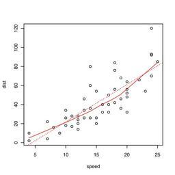 | Keywords: R-car stopping distances 1920-plain.svg en Example used in the wikibook Statistical_Analysis _an_Introduction_using_R generated by <pre>> svg R-car_stopping_distances_1920-plain svg 4 4 8 > plot dist ~ speed data cars It is easy to do a simple plot > smooth line <- lowess cars speed cars dist The lowess function fits a LOcally WEighted Scatterplot Smoother > lines smooth line col red lines adds lines to a plot here the lowess smooth-line fit > straight line model <- lm dist~speed data cars This creates and stores a model lm means Linear Model > abline straight line model col red lty 3 abline is a simple function that plots a straight line > dev off </pre> Created with R Own HYanWong 2008-11-30 Uncategorized 2015 March 23 |