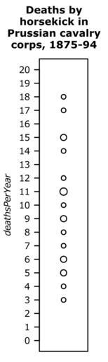 | Keywords: R-horsekick totals-1D size.svg en Example R Plot - vertical 1D stacked point plot stacked dotplot of von Bortkiewicz's famous dataset of deaths by horse kick in Prussian cavalry corps own HYanWong 2009-03-06 Created with R using the following commands <pre> svg file R-horsekick_totals-1D_size svg width 1 5 height 5 pointsize 8 Example R Plot - vertical 1D stacked point plot stacked dotplot of von Bortkiewicz's famous dataset of deaths by horse kick in Prussian cavalry corps library pscl par mar c 1 4 6 2 +0 1 t <- table tapply prussian y prussian year sum stripchart as numeric names t pch 1 cex sqrt t ylab expression italic deathsPerYear vertical TRUE las 1 yaxp c 0 20 20 ylim c 0 20 title Deaths by\nhorsekick in\nPrussian cavalry\ncorps 1875-94 outer TRUE line -5 dev off </pre> Dot plots |