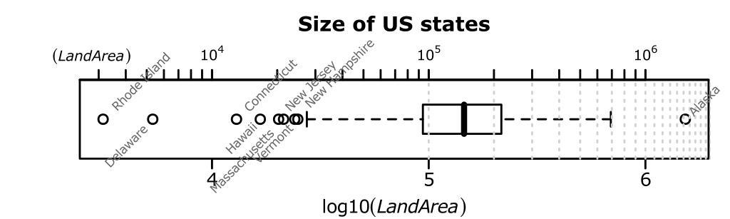 | Keywords: R-US state areas-boxplot log+extras.svg en Horizontal boxplot example with logged base 10 continuous data outliers identified by name and both log linear axes plotted Data US state areas Own HYanWong 2009-03-06 Created with R using the following commands <pre> svg file R-US_state_areas-boxplot_log+extras svg width 5 height 1 5 pointsize 8 Horizontal boxplot example with logged base 10 continuous data outliers identified by name and both log linear axes plotted Data US state areas par mar c 3 4 4 1 +0 1 X <- log10 state area 2 58998811 bp <- boxplot X horizontal TRUE xaxt n xlab axis 1 4 6 mgp c 1 5 0 5 0 axis 3 log10 1 9 rep 10 3 7 each 9 rep 45 axis 3 log10 10 3 6 expression 10 3 10 4 10 5 10 6 cex axis 0 8 mgp c 2 5 1 0 mtext expression italic LandArea 3 line 0 8 adj -0 05 cex 0 8 abline v log10 seq 0 2e6 100000 lty dotted col lightgray title main Size of US states line 2 5 title xlab expression log10 italic LandArea mgp c 2 0 5 0 Label outliers outliers <- order match X sort boxplot stats X out na last NA odd <- c TRUE FALSE text Xoutliersodd 1 labels state nameoutliersodd adj -0 2 cex 0 65 srt 45 xpd NA col grey40 text Xoutliers odd 1 labels state nameoutliers odd adj 1 2 cex 0 65 srt 45 xpd NA col grey40 dev off </pre> Box plots Images with R source code |