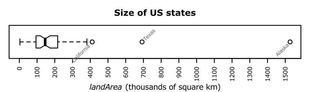 | Keywords: R-US state areas-boxplot.svg en Boxplot example with notches for continuous data with outliers labelled by name Data US state areas own HYanWong 2009-03-06 Created with R using the following commands <pre> svg file R-US_state_areas-boxplot svg width 5 height 1 5 pointsize 8 Boxplot example with notches for continuous data with outliers labelled by name Data US state areas par mar c 4 1 3 1 +0 1 X <- state area 2 58998811/1000 bp <- boxplot X notch TRUE horizontal TRUE xlab expression paste italic landArea thousands of square km xaxt n axis 1 seq 0 2e3 100 cex axis 0 8 las 2 label outliers outliers <- order match X sort bp out na last NA odd <- c TRUE FALSE text Xoutliers odd 1 labels state nameoutliers odd adj -0 2 cex 0 65 srt 45 xpd NA col grey40 text Xoutliersodd 1 labels state nameoutliersodd adj 1 2 cex 0 65 srt 45 xpd NA col grey40 title Size of US states dev off </pre> Box plots Images with R source code |