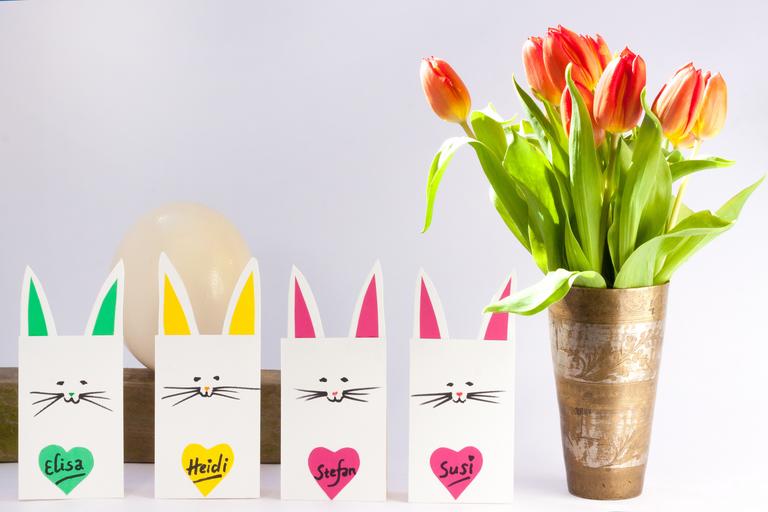 Keywords: rabbit hand labor tinker paper bunny stand table decoration chalkboard easter egg tulips bouquet spring nature flowers schnittblume blossom bloom plant flora flower bracts red orange lily