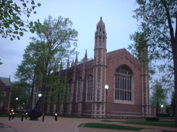Keywords: Rabbit staring at graham.JPG Graham chapel is on the right the rabbit statue is to the left Washington University in St Louis Cope and Stewardson 2002-04-19 own assumed Bachrach44