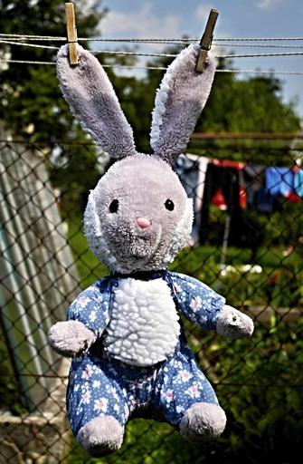 Keywords: rabbit toy hanging ears puppy on the line drying washed