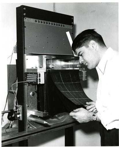 | Keywords: RabinowJacob 045.jpg The directory shown here converts according to a pre-arranged schedule the information in the 64-but code of the abbreviated address on the envelope into a 12-bit code corresponding to the receptacle where the letter is to be dropped by the conveyor In 1957 Jacob Rabinowâ ‚¬ „˘s company Rabinow Engineering designed a mechanical coding and sorting system for the U S Post Office Based on similar work Rabinow had done previously for the Census Bureau the system for the Post Office consisted of a conveyor belt cart designed to carry 12 envelopes in separate compartments Each compartment in the cart was accompanied by an escort memory The escort memory consisted of a shaft carrying a series of nylon code wheels Each of the 134 wheels could move laterally into one of two positions With this combination more than 8000 in decimal notation binary numbers could be set Twelve keyboard operators would read envelope addresses and set the positions of the code wheels The wheels were supported on a track also composed of binary elements When the encoded compartment hit the same encoded position on the track the shaft dropped triggering a door release in the compartment holding the envelope The envelope then fell into the appropriate pocket About 600 of the letter sorting machines were built and used by the Post Office In later operations optical character recognition technology replaced the keyboard operators and the mechanical escort memory was replaced by computer memory Reference Inventing for Fun and Profit Jacob Rabinow San Francisco Press San Francisco CA 1990 pp 100-138 National Institute of Standards and Technology 4/1/1958 National Institute of Standards and Technology PD-USGov-NIST PD-USGov Postal equipment |