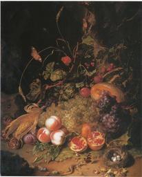 | Keywords: Rachel Ruysch - still life with fruit a nest and a lizard - 1710.jpg Flower still life Stilleven van vruchten met insecten en een vogelnest op een ondergrond van mos met kiezelstenen 1710 gedateerd en <br> Paintings Oil on canvas 87 by 69 5 cm accession number Creator Rachel Ruysch 1712 object history Sold by the heirs of Catharina Backer in Leiden 1766-09-08; 1768 owned by monsieur de Séréville Paris; auctioned on 1812-01-22; auctioned 1912-02-10 and sold to Sir John Crichton-Stuart 4th Marquess of the County of Bute Londen; by descent through the family until being sold in July 1996; sold again in 1997 signed below left Rachel Ruysch / 1710; a pendant to this painting was sold at Christie's 10-2-1912 http //www niceartgallery com/Rachel-Ruysch/Still-Life-of-Fruit-with-a-Birds-Nest-and-Insects -1710 html Private collection other versions PD-Art-100 Rachel Ruysch Collection Catharina Backer Bird nests in art Fruit still life paintings by Rachel Ruysch |