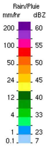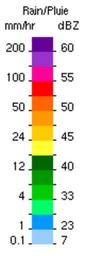 Keywords: Radar échelle réflectivité.png en Color scale sample for weather radar reflectivity in rain rate and dBZ fr Expemple d'échelle de couleur associée avec une image de réflectivité pour un radar météorologique On y retrouve l'intensité taux de précipitation et en correspondance en dBZ own Pierre cb 2009-12-15 Weather radar images types |