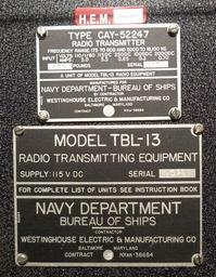 Keywords: Radio Transmitter Model TBL-13, US Navy, Westinghouse - National Electronics Museum - DSC00254.JPG en Exhibit in the National Electronics Museum 1745 West Nursery Road Linthicum Maryland USA All items in this museum are unclassified The museum permitted photography without restriction 2014-07-21 14 56 09 own Daderot cc-zero Radios in the National Electronics Museum Uploaded with UploadWizard TBL-13 radio transmitters |