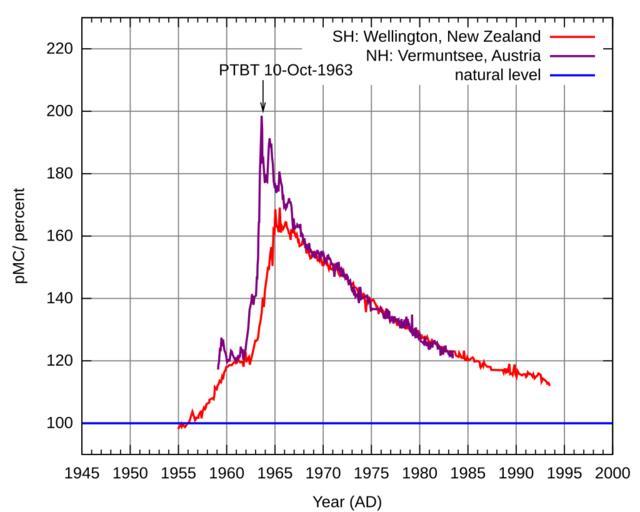 Keywords: Radiocarbon bomb spike.svg validSVG Atmospheric <sup>14</sup>CO<sub>2</sub> in the second half of the 20<sup>th</sup> century The figure shows the <sup>14</sup>C / <sup>12</sup>C ratio relative to the natural level in the atmospheric CO<sub>2</sub> as a function of time in the second half of the 20th century The plot was generated with gnuplot from data of atmospheric radiocarbon in Wellington New Zealand 1954AD to 1993AD and at the Vermuntsee Austria 1959AD to 1983AD The SVG file from gnuplot has been improved manually The data sources provide the data as D14C For the plot the absolute percent modern value has been calculated assuming that each measurement was done in the same year as the respective sample was taken Atmosphärisches <sup>14</sup>CO<sub>2</sub> in der zweiten Hälfte des 20 Jahrhunderts Own work Data from the following sources http //cdiac esd ornl gov/trends/co2/welling html Manning M R and W H Melhuish 1994 Atmospheric 14C record from Wellington In Trends A Compendium of Data on Global Change Carbon Dioxide Information Analysis Center Oak Ridge National Laboratory U S Department of Energy Oak Ridge Tenn U S A http //cdiac esd ornl gov/trends/co2/cent-verm html Levin I B Kromer H Schoch-Fischer M Bruns M Münnich D Berdau J C Vogel and K O Münnich 1994 δ14CO2 record from Vermunt In Trends A Compendium of Data on Global Change Carbon Dioxide Information Analysis Center Oak Ridge National Laboratory U S Department of Energy Oak Ridge Tenn U S A AD 2008-08-09 Hokanomono All rights for generating the graphics shall be released As far as I know there is no copyright protection on measurement data in general Image Atmospheric radiocarbon 1954-1993 svg Gnuplot script <pre> reset set term svg enhanced set output plot svg set xdata time set timefmt Y- m- d set xrange 1945-1-1 2000-1-1 set format x Y set xtics 5 31556926 set grid set title 'Atmospheric 14 CO_ 2 ' set xlabel 'Year AD ' set ylabel 'pMC/ percent' see Stuiver Polach for conversion between D14C and pMC lambda 1 0 / 8267 365 2422 24 3600 set arrow from 1963-10-10 210 to 1963-10-10 200 set label PTBT 10-Oct-1963 at 1963-10-10 210 offset -5 0 5 plot 90 230 <awk ' / / print \ 19\ 1 \ -\ 2 \ -\ 3 mktime sprintf \ 19 02i 02i 02i 00 00 00\ 1 2 3 - mktime \ 1950 01 01 00 00 00\ 6 7; ' welling 195 us 1 3+1000 exp -lambda 2 0 1 tit 'SH Wellington New Zealand' w lines <awk 'BEGIN FIELDWIDTHS \ 1 7 5 7 5 2 3 3 4 2 3 3 5 6 5 4 3 2 1\ ; / HD-/ a mktime sprintf \ 19 02i 02i 02i 00 00 00\ 8 7 6 ; b mktime sprintf \ 19 02i 02i 02i 00 00 00\ 12 11 10 ; present mktime \ 1950 01 01 00 00 00\ ; printf \ s g 4g 2g\\n\ strftime \ Y- m- d\ a+b /2 b-a /2 b-present 16 18; ' vermunt c14 us 1 4+1000 exp -lambda 3 0 1 tit 'NH Vermunt Austria' w lines 100 tit 'natural level' set output </pre> Gnuplot diagrams Earth's atmosphere 1963 Nuclear fallout Carbon-14 |