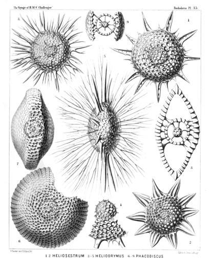 | Keywords: Radiolaria (Challenger) Plate 035.jpg follows <table> <tr> <td style text-align center; vertical-align top; colspan 3 >Plate 35 Phacodiscida </td> </tr> <tr> <td style font-size 85 ; text-align right; vertical-align top; colspan 3 >Diam </td> </tr> <tr> <td style vertical-align top; >Fig 1 Heliodiscus pertusus n sp vel Heliosestrum pertusum </td> <td style vertical-align bottom; >×</td> <td style text-align right; vertical-align bottom; >400</td> </tr> <tr> <td style font-size 85 ; padding-left 3em; text-indent -1em; vertical-align top; >Irregular form with ten instead of eight larger latticed spines </td> </tr> <tr> <td style vertical-align top; >Fig 2 Heliodiscus glyphodon n sp vel Heliosestrum glyphodon </td> <td style vertical-align bottom; >×</td> <td style text-align right; vertical-align bottom; >300</td> </tr> <tr> <td style vertical-align top; >Fig 3 Heliodrymus ramosus n sp </td> <td style vertical-align bottom; >×</td> <td style text-align right; vertical-align bottom; >300</td> </tr> <tr> <td style vertical-align top; >Fig 4 Heliodrymus ramosus n sp </td> <td style vertical-align bottom; >×</td> <td style text-align right; vertical-align bottom; >500</td> </tr> <tr> <td style font-size 85 ; padding-left 3em; text-indent -1em; vertical-align top; >Medullary shell and a segment of the disk </td> </tr> <tr> <td style vertical-align top; >Fig 5 Heliodrymus viminalis n sp </td> <td style vertical-align bottom; >×</td> <td style text-align right; vertical-align bottom; >400</td> </tr> <tr> <td style font-size 85 ; padding-left 3em; text-indent -1em; vertical-align top; >Marginal view </td> </tr> <tr> <td style vertical-align top; >Fig 6 Phacodiscus clypeus n sp </td> <td style vertical-align bottom; >×</td> <td style text-align right; vertical-align bottom; >400</td> </tr> <tr> <td style vertical-align top; >Fig 7 Phacodiscus rotula n sp </td> <td style vertical-align bottom; >×</td> <td style text-align right; vertical-align bottom; >400</td> </tr> <tr> <td style font-size 85 ; padding-left 3em; text-indent -1em; vertical-align top; >Marginal view </td> </tr> <tr> <td style vertical-align top; >Fig 8 Phacodiscus lentiformis n sp </td> <td style vertical-align bottom; >×</td> <td style text-align right; vertical-align bottom; >400</td> </tr> <tr> <td style font-size 85 ; padding-left 3em; text-indent -1em; vertical-align top; >Vertical section nearly through the centre </td> </tr> <tr> <td style vertical-align top; >Fig 9 Phacodiscus clypeus n sp </td> <td style vertical-align bottom; >×</td> <td style text-align right; vertical-align bottom; >400</td> </tr> <tr> <td style font-size 85 ; padding-left 3em; text-indent -1em; vertical-align top; >Vertical section nearly through the centre </td> </tr> </table> https //archive org/details/reportonradiolar00haecrich 1887 Ernst Haeckel 1834-1919 ; engravings by Adolf Giltsch 1852-1911 PD-old-auto-1923 1919 Report on the Radiolaria |